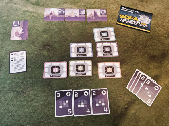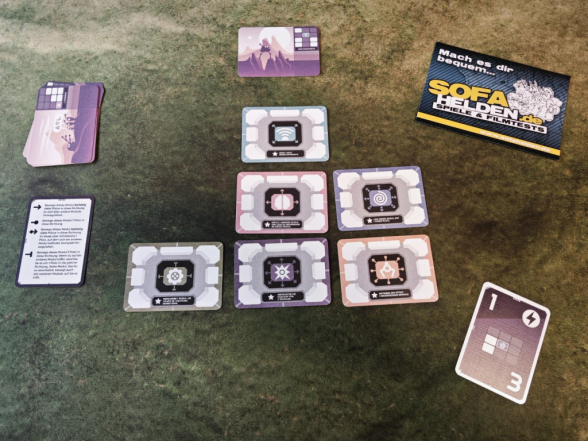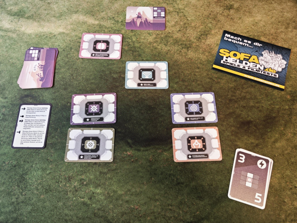 In diesem spannenden Solospiel gibt es immer ein aktives Muster (Mission), an dem ihr arbeitet. Euer Ziel ist es, eure Module geschickt in Position zu bewegen, um das Muster auf der Missionskarte zu erzeugen. Dies erreicht ihr, indem ihr Bewegungskarten spielt, die euch zwischen 1 und 5 Bewegungspunkte geben, um eure Module zu bewegen. Es gibt auf jeder Bewegungskarte zwei Zahlen, eine niedrige und eine höhere. Ihr erhaltet die höhere Zahl als Bewegungspunkte, wenn das auf der Bewegungskarte abgebildete Modul-Raster mit dem tatsächlichen Raster übereinstimmt. D.h. man sollte sich überlegen ob bestimmte Modul-Anordnungen als Zwischenziele auf dem Weg zur Erfüllung der Mission Sinn machen, um mehr Bewegungspunkte zu erhalten.