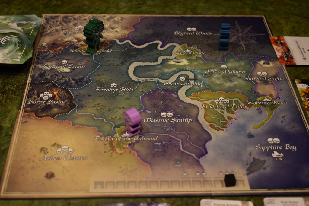 In der Reisephase habt Ihr die Wahl, die Karte zu bereisen. Dabei müsst Ihr darauf achten, dass die Felder, die Ihr betretet, der Schädelzahl entsprechen, die Ihr auf der Erfahrungsleiste bereits erreicht habt. Zu Beginn könnt Ihr also nur die Gebiete bereisen, die nur einen Schädel haben. Laufen könnt Ihr auf angrenzende Gebiete bis zu drei Felder. Dabei müsst Ihr bei zwei eine und bei drei zwei Wunden erleiden. Dies soll die Strapazen einer längeren Reise darstellen. Als Sonderregel gibt es noch den Fluss in der Mitte. Er kann ausschließlich über die Brücke in „Great Crossing“, dem Schiff auf dem Meer oder ganz im Norden in Frostbite Peak überquert werden.