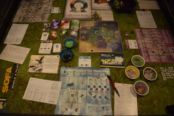 Nachdem Ihr Euren Zielort erreicht und gegebenenfalls erkundet habt, folgt der größte Teil des Spiels: Die Eventphase. Hierbei werft Ihr die beiden Eventwürfel und erhaltet so eine Zahl. Eine andere Person nimmt das Abenteuerbuch und sucht die Kombination aus Gebiet und dieser Zahl heraus. Manche Events bringen Euch „nur“ etwas Geschichte, andere bringen Euch Vorteile in Eurer Reise in Form von Ressourcen, Ruf oder Erfahrung und wiederum andere führen in einen Kampf. Manchmal müsst Ihr würfeln, um zu sehen was passiert. Das könnt Ihr aber durch Eure Attribute beeinflussen und manchmal dürft Ihr Euch auch entscheiden, was ihr macht. Kommt es zu einem Kampf, werden das Abenteuerbuch offen ausgelegt und die Würfel auf den Lebenspunkten der Gegner platziert. Dann würfelt Ihr gleichzeitig und macht Euch so durch die Kombination aus Würfelergebnis und Fertigkeiten, gegenseitig Schaden. Dieses Prinzip ist sehr interessant, weil Ihr eben nicht möglichst hoch würfeln müsst, sondern die Ergebnisse, die Eure Fertigkeitskarten vorgeben. Außerdem hat jeder Charakter die Möglichkeit die eigenen Würfelergebnisse und die des Monsters zu beeinflussen. Entweder durch neuwürfeln oder addieren/subtrahieren bestimmter Werte.