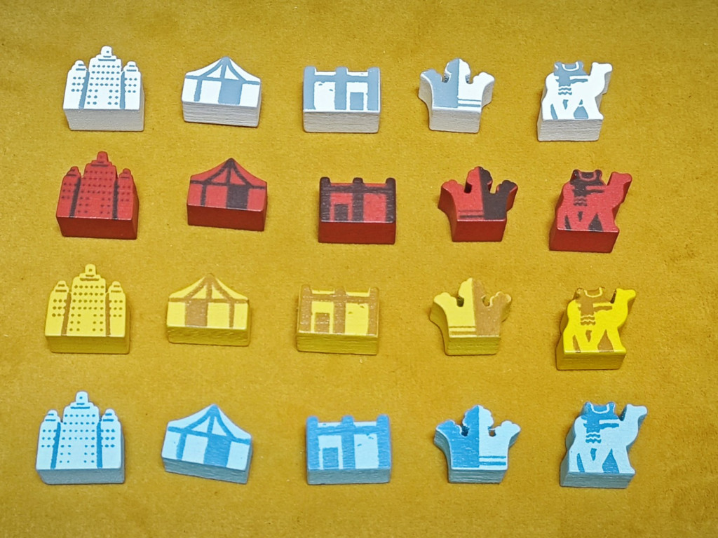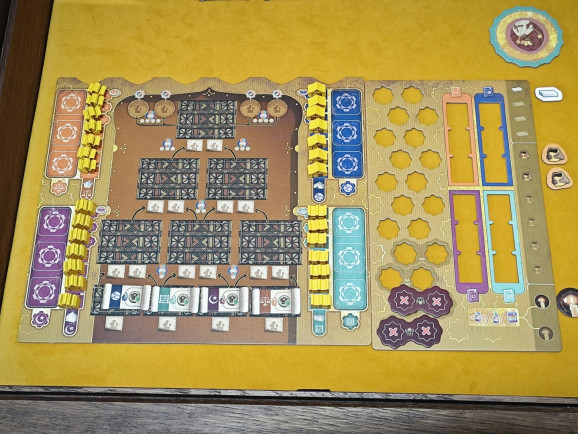 Zuletzt erhält jeder Spieler genau vier Zielkarten, deren Erfüllung im Spielverlauf Sonderfähigkeiten freischalten. Sie bestimmen die Strategie zu Beginn des Spiels. Der Startspieler erhält das Haddsch Plättchen. Nun kann es losgehen.