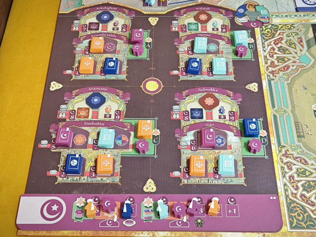 Die Tischpräsenz von Sankoré ist, wie kann man das treffend formulieren? Sehr einnehmend. Selbst in einer 2-Spieler-Partie wird sehr viel Platz benötigt. Der Spielplan ist riesig und auch die Spieler-Tableaus überdurchschnittlich groß, sodass wir Probleme hatten gegenüberzusitzen und den Spielplan zwischen uns zu positionieren. Der Aufbau ist aber nicht nur einnehmend, sondern auch wirklich hübsch und nach etwas Gewöhnungszeit erkennt man auch Struktur und Übersichtlichkeit. Besonders gut haben uns die vielen bedruckten Holzkomponenten gefallen, insbesondere die Bücher und Ansehensmarker in den Farben der vier Fachbereiche, aber auch die etwas kleineren Komponenten in Spielerfarben.