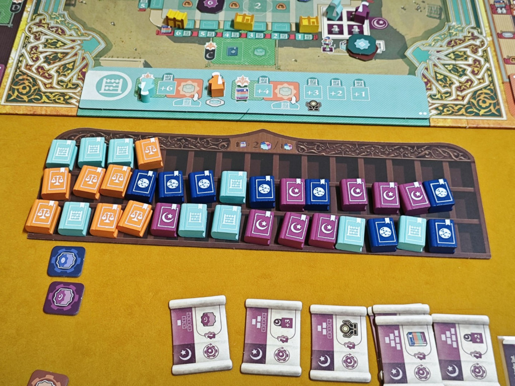 Schauen wir uns nun das persönliche Spielertableau an, das sich aus dem Fakultätstableau und dem Ressourcentableau zusammensetzt. Das Fakultätstableau gliedert sich in zwei Bereiche. Im zentralen Bereich werden unten vier Grundkurs-Plättchen, eines für jeden Fachbereich platziert. Auf den Feldern darüber ist Platz für Hauptkurs-Plättchen, die im Spielverlauf eingerichtet werden können. Unterhalb eines jeden Kursfeldes gibt es Platz für Studenten. Sie können im Spielverlauf beginnend von den Grundkursen ganz unten von Kurs zu Kurs nach oben bewegt werden. Die Auslage der Hauptkurs-Plättchen wird neben dem Spielplan vorbereitet und jeder Spieler beginnt bereits mit einer Kombination aus einem Buch, einem Studenten und einem Hauptkurs, welche aus einer zufälligen Auslage in Spielerreihenfolge ausgewählt werden. Der zweite Bereich des Fakultätstableaus befindet sich am rechten und linken Rand. Für jede der vier Fachbereiche werden hier die entsprechenden Gebäude platziert. Kronen für Recht; Moscheen für Theologie; Handelsposten für Astronomie; und Mauern für Mathematik. Neben den Gebäuden gibt es jeweils drei Plätze für Fähigkeitsplättchen, die im Spielverlauf erhalten werden können.