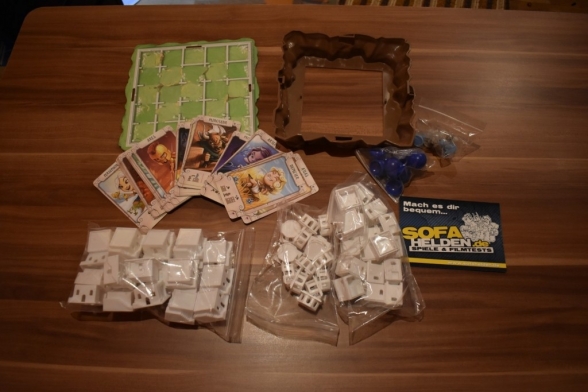 Hält man die Verpackung von Santorini das erste Mal in der Hand, merkt man schon, wie voll sie ist und wie sie rasselt, wenn man sie leicht schüttelt. Im Inneren befinden sich vier Zip-Beutel mit Gebäudeteilen, den Klippen von Santorini aus Kunststoff, sechs Spielfiguren und einem Spielplan, den man für das spätere Spiel auf die Klippen aufstecken muss. Außerdem befindet sich eine hochwertigere Anleitung auf Deutsch und je eine weitere auf Englisch, Französisch, Italienisch und Niederländisch in der Verpackung. Das Spielmaterial macht einen sehr guten Eindruck.