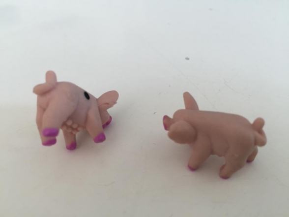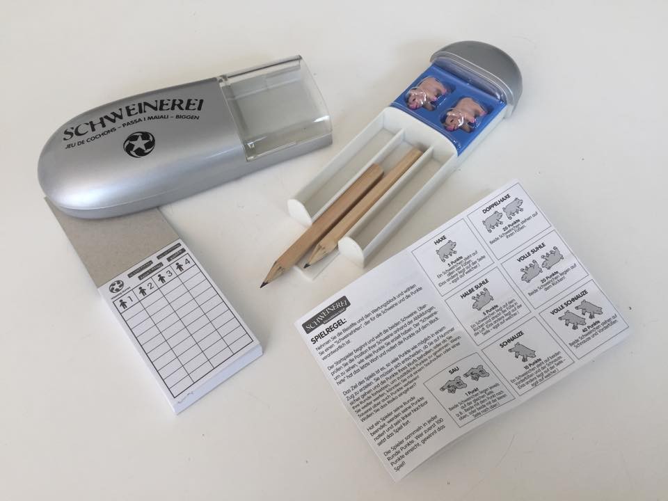 Das Spielmaterial ist einfach gehalten, ein Spielbrett gibt es nicht. Das komplette Spiel besteht aus zwei Schweine-Würfeln, zwei kleinen Bleistiften, einem Spielblock, der Anleitung und einer schicken Verpackung. Die Schweine sind aus sehr hartem Gummi, was sie nahezu unzerstörbar macht. Alles hat in dem Etui Platz, welches sehr platzsparend ins Regal oder in den Schrank passt.