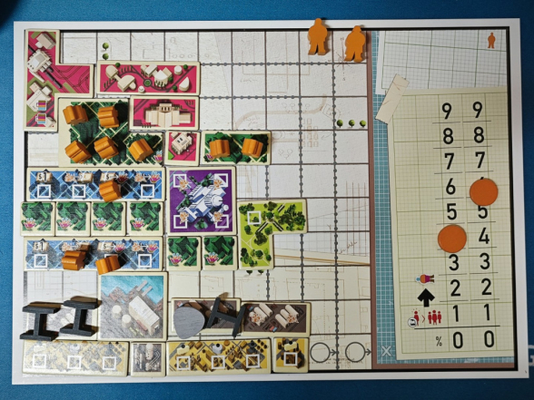 Neben den Stadtratsplan wird der allgemeine Vorrat an Gebäudeplättchen gebildet. Die meisten Gebäude sind nicht limitiert, so z.B. Wohnsiedlungen (dunkelgrün), Fabriken (gelb), Gewerbe (blau) und Parks (hellgrün). Öffentliche Gebäude (rot) und Spezialgebäude wie Polizeistation und Feuerwache sind allerdings limitiert; ihre Anzahl ist abhängig von der Spielerzahl. Nicht jeder Spieler wird jedes dieser Gebäude bauen können, sodass hier Konkurrenz und ein kleines Wettrennen entsteht. Die meisten Gebäudeplättchen gibt es in verschiedenen Formen und Größen. Der Bau hat auch unterschiedliche Voraussetzungen, was Anzahl und Größe benachbarter Gebäude und/oder Ressourcen betrifft. Außerdem gibt es den Effekt des automatischen Wachstums der Gebäudeplättchen. Stadtplanung ist damit ein großes Puzzle und bedarf viel Vorausplanung. Wozu das Ganze? Die Gebäude liefern Arbeitereinsatzfelder für die Bürger, um diese zu aktivieren und Ressourcen, Siegpunkte und andere Spieleffekte zu generieren.