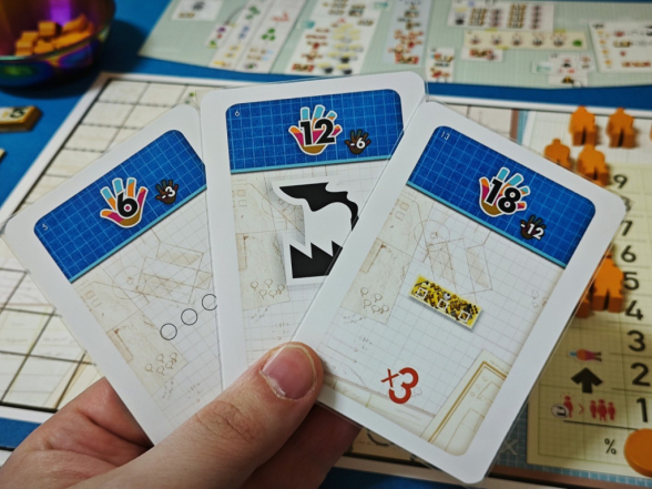 Nun müssen die Karten mit den Versprechen vorbereitet werden. Die Versprechen sind Zielkarten, für die es am Spielende Siegpunkte gibt, die also die persönliche Strategie beeinflussen können. Es gibt Karten in drei Schwierigkeitsstufen, die separat gemischt werden. Schwierigere Versprechen geben dabei mehr Siegpunkte. Jeder Spieler erhält eine Karte von jeder Schwierigkeit und darf sich dann für eine Karte entscheiden. Die anderen beiden Karten werden abgeworfen. Dann wird der Startspieler bestimmt. Der Startspieler ist gleichzeitig Gastgeber des Bürgermeisters, der als Handicap fungiert und Bauplätze blockiert. Abhängig von der Spielerreihenfolge gibt es dann noch vier bis sechs Geld Startkapital. Nicht gerade viel.