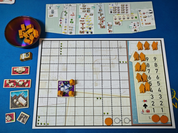 Schauen wir uns also den Spielaufbau und die Spielkonzepte etwas genauer an. Der Spielaufbau geht relativ zügig vonstatten, mal ein positiver Aspekt. Zentraler Bereich für jeden Spieler ist das persönliche Bezirkstableau. Das sieht wieder erstmal sehr schlicht aus. Auf dem Raster werden im Spielverlauf aber die bunten Gebäude-Plättchen nach bestimmten Legeregeln platziert, dann macht es schon etwas mehr her. Gebäude liefern Arbeitereinsatzfelder, um Geld, Siegpunkte und Baumaterialien zu generieren. Das Raster ist zu Spielbeginn begrenzt, was durch das Platzieren einer Holz-Scheibe, des so genannten Grenzsteins unten rechts angezeigt wird. Man hat also zu Beginn nur ein 7x7 Raster zur Bebauung zur Verfügung, das schrittweise auf ein 10x10 Raster erweitert werden kann. Auf der rechten Seite des Bezirkstableaus werden zwei Holz-Scheiben platziert, um die Luftverschmutzung von 0 bis 99% zu tracken. Erreichen die Marker die 100% Marke, hat man das Spiel direkt verloren. Unabhängig davon gibt jeder Punkt Luftverschmutzung am Spielende einen Minuspunkt. Oben rechts ist das Arbeitsamt, in dem 11 Bürger platziert werden. 8 Bürger kommen in den Vorrat und können im Spielverlauf angeworben werden. Die Bürger sind die eigenen Arbeiter, die in Gebäude der eigenen Stadt platziert werden können, um Siegpunkte, Geld oder Baumaterialien zu generieren oder andere Effekte zu triggern.