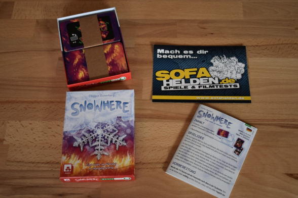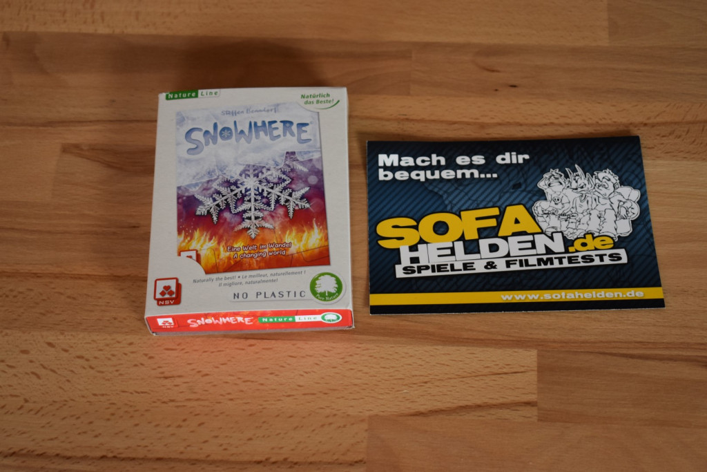 Die erste Auffälligkeit von Snowhere ist die Verpackung und das Spielmaterial. Wie auf dem Kartonschuber aufgedruckt, verzichtet man hier komplett auf Plastik. Der Karton ist in einem Schuber untergebracht und die beiden Kartenstapel sind in Bandagen aus vermutlich recyceltem Papier gehüllt. Hinzu kommt dann nur noch die Anleitung, die natürlich auch nicht aus Plastik ist.