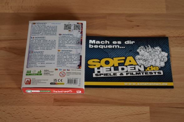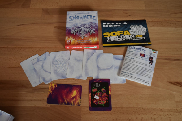 Wie man an dem imaginär qualmenden Spieltisch erkennen kann, ist die Lava ausgebrochen und wir müssen uns darum kümmern diese zu löschen. Das passiert mit der Kartenrückseite, dem Schnee. Zug um Zug versuchen wir die Lava komplett mit Schnee zu bedecken. Gelingt uns das, haben wir das Spiel gewonnen. Bleibt noch Lava übrig, haben wir verloren.