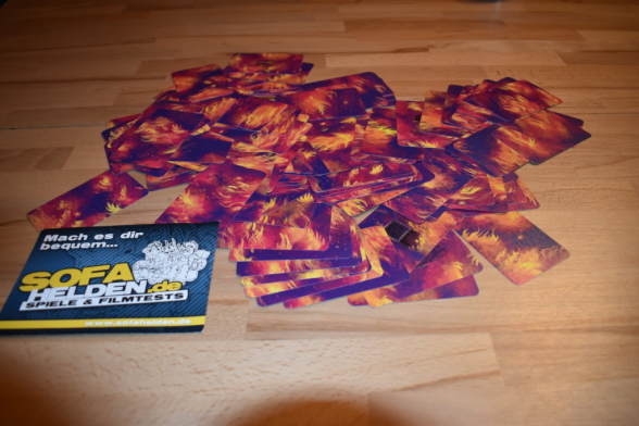 Der Spielaufbau ist relativ einfach und erinnert an Mikado oder „32-heb-auf“. Die Übersichtskarte wird aussortiert. Die übrigen Karten werden mit der Lava-Seite nach oben als Haufen auf dem Tisch verteilt. Wichtig ist dabei, dass sie nicht einzeln rumliegen, sondern wirklich einen Lava-Haufen bilden. Dann kann es auch schon an die erste Runde gehen.