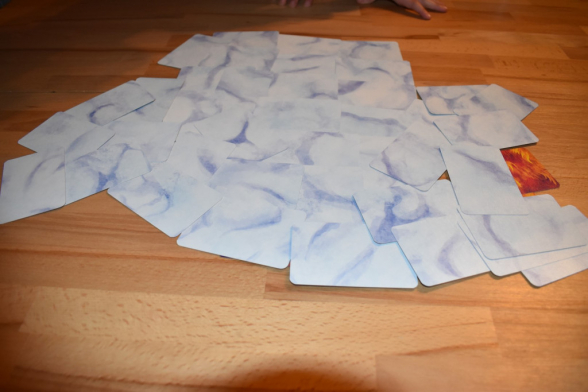 Reihum versuchen wir die Lava zu löschen. Dabei besteht ein Zug aus zwei Phasen. In der ersten wählt man eine Lava-Karte, die von keiner anderen Karte bedeckt ist. Diese nimmt man auf und dreht sie um. Ist auf der Rückseite eine Schneeflocke abgebildet, ist das gut und man legt die Karte vorerst beiseite. Ist dort nur Schnee abgebildet, muss man sie geschickt auf dem Lava-Haufen positionieren. Dabei muss man im Hinterkopf haben, dass das Ziel des Spiels ist, die Lava Lückenlos und komplett zu überdecken. Hierbei sind die Legeregeln der Anleitung noch einmal genau zu studieren. Im Wesentlichen lässt es sich so zusammenfassen, dass keine Lava mehr zu sehen sein darf und man am Rand etwas überlappend legen muss. Wichtig ist dabei auch, dass Karten, die von einer Schneekarte bedeckt sind, nicht mehr aufgenommen werden können. Somit muss man sich genau überlegen, wie man die Karten legt, da man ja noch weitere für den Rest des Feuers im späteren Verlauf ziehen können muss. Nachdem ein*e Spieler*in die zwei Aktionen durchgeführt hat, ist der oder die nächste an der Reihe. Das geht so lange bis keine freien Lavakarten mehr gezogen werden können. Dann dürfen noch die beiseitegelegten Schneeflockenkarten auf der übrigen Lava verteilt werden. Gelingt es damit die Lava vollständig zu überdecken, haben hat die Gruppe gewonnen, gelingt das nicht, hat sie zumindest warme Füße.