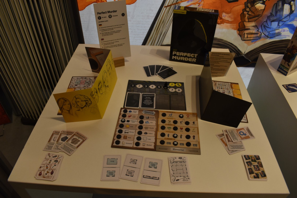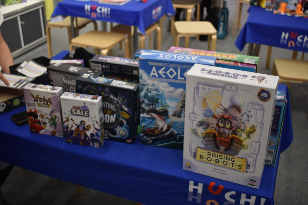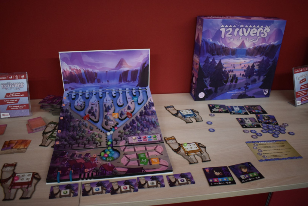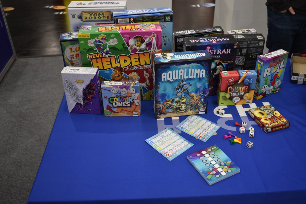 Ebenfalls am Amigo-Stand befand sich der Verlag Peasoup, der zwei „Spielbücher“ herausbringt, die uns gerade mit einem Kind in der Grundschule besonders gelockt haben. In einer Kombination aus klassischem Abenteuerbuch, einer App und Karten sind wir hier sehr gespannt, wie das Spiel bei Kindern ankommt. Dann ging es weiter zu Hutter, die sich nun auch mit um den Vertrieb des „Spiel Das!“-Verlags kümmern. Hier gab es interessante Ausblicke auf Jiangnan, Workerplacement in China, das kooperative Bergsteiger-Spiel The Peak Team und ein paar interessante Logik-Spiele. Von „Spiel Das!“ stach uns vor allem das uns bereits bekannte Aqualuma und Aelos ins Auge. Aber auch Raising Robots und die Vielfalt an Würfel- und 2-Spieler-Spielen weckten unsere Aufmerksamkeit.