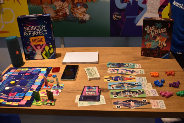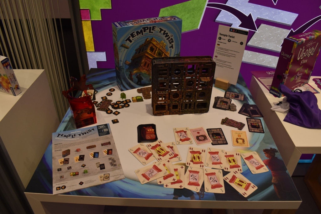 Den Abschluss des Tages machte Kosmos. Hier gab es ordentlich auf die Ohren, denn man bringt hier nun auch ein Musikspiel im Hitster-Stil heraus. Play macht aber ein paar Sachen anders. So kann man sich vorab pro Team für unterschiedliche Genres zum Raten entscheiden und man hat unterschiedliche Spielmodi, wie beispielsweise „früher“ und „später“, die sich aber auch auf die Erscheinungsjahre der Titel beziehen. Dafür ist man allerdings nicht auf Spotifiy eingeschränkt, sondern kann auch andere Anbieter wie beispielsweise Apple Music verwenden. Darüber hinaus gab es einige Kartenspiele zu entdecken, von denen uns besonders die Neuauflage von Catan - Das Kartenspiel nahegelegt wurde. Hier sind wir schon sehr gespannt. Es macht einiges anders und einfacher. Besonders interessant wirkte der Aufbau von Temple Twist, einem kooperativen Labyrinth-Spiel, das dieses Jahr sogar den Toy Award gewinnen konnte. Mit Kosmos und schweren Füßen endete dann auch unser erster Messetag etwas früher. Schließlich wussten wir, dass der Donnerstag mit der Red Night etwas länger werden würde.