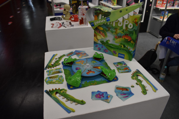 Nach einem kurzen Abstecher bei GiGamic und allplay widmeten wir uns dem gigantischen Stand von Simba Dickie, bei dem uns neben den Brettspielneuheiten von Zoch und Noris noch diverse neue Spielwaren präsentiert wurden. Es ging von Kinderspielen wie Flitze Flatze Bärentatze über Logikspiele wie IQ Rope und kuscheligen Glücksbärchis bis hin zu massiven Actionfiguren aus Metall von amerikanischen Subunternehmen.