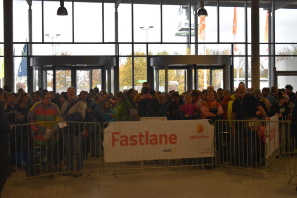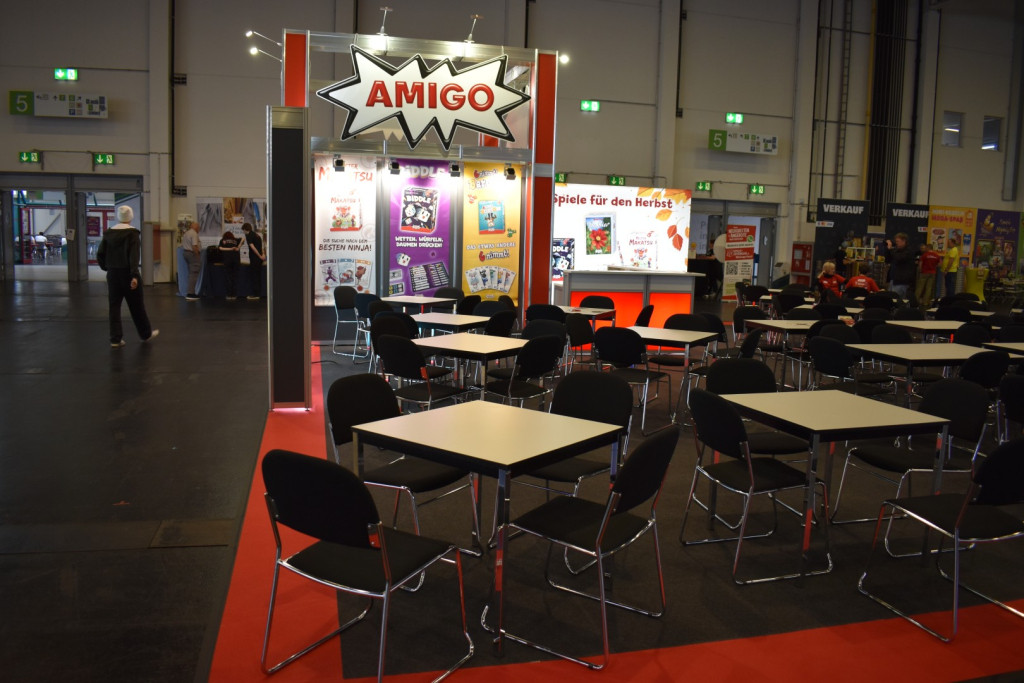 Dieses Jahr waren wir bewusst noch etwas früher als sonst auf der Messe. Nicht nur, weil wir es durch die Ferien mit den Kindern konnten, sondern auch, weil wir Großes vorhatten. Eine kleine Idee war etwas eskaliert und endete in mehr Planung als erwartet. Damit war unser erster Weg nach der Anmeldung erst einmal der Kosmos-Stand zur Abstimmung bezüglich unseres Catan Connect Events. Dieses Jahr in Halle 5, denn die Ausstellerhalle wurde mit der Halle der Spielfläche getauscht. Noch wirkte alles sehr ruhig. Die Aussteller*innen bereiteten Ihre Stände vor, die Erklärer*innen die Spielothek und auch an anderer Stelle bereitete man sich auf die Besuchenden vor.