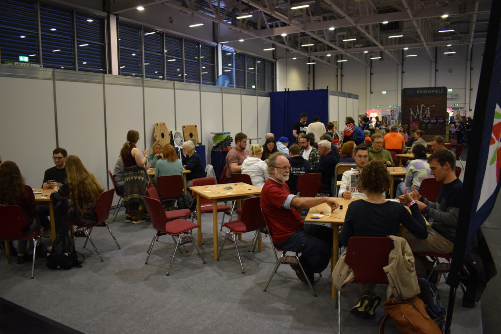Tag 2 bedeutete nicht nur für uns mehr Personen, mit denen wir spielen „mussten“, sondern auch mehr Besucher für die Spielwiesn. Man merkte schon direkt beim Einlass: heute ist deutlich mehr los. Anders als am ersten Tag entschied sich die Security auch dazu, die Tickets der Besucher*innen schon einzuscannen und alle vor den Hallen zu sammeln, bevor die Türen zu ebendiesen geöffnet werden. Nachdem die Messe offiziell eröffnet war, mischten auch wir uns unters Volk und schlossen als erstes unsere Bildungslücke bezüglich des originalen 7 Wonders. Anschließend versuchten wir uns an Van Helsing und tauchten ab mit The Crew: Mission Tiefsee. Dann standen wir etwas auf dem Schlauch, was wir spielen sollten. Also drehten wir eine Runde durch die Halle 5, um vielleicht einen Verlagstisch zu ergattern, aber: keine Chance. Somit blieb noch eine Hoffnung: ein größeres Spiel auf der Exklusiv-Fläche zu spielen. Und siehe da: hier konnten wir noch einen letzten Tisch ergattern und das Spiel Thebai anspielen. Letztes Jahr gab es diese Fläche auch schon, doch wir hatten sie noch nicht genutzt. Dieses Jahr war sie größer und wir hatten das Gefühl, dass man hier gut Chancen hat, einen Platz zu ergattern und zu spielen. In unseren Augen eine sehr gute Lösung für die teureren Spiele. Hier waren auch einige Erklärer*innen unterwegs, sodass sich die meist komplexeren Spiele nicht erst durch die Regelstudie in die Länge zogen. Auch dieses Jahr wurden etwa gegen Mittag weitere Spielflächen eröffnet. Dieses Mal wurde Halle 4 hinzugefügt und mit Tischen und Bänken ausgestattet.