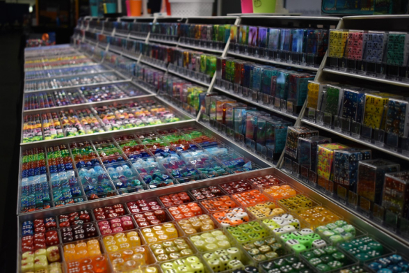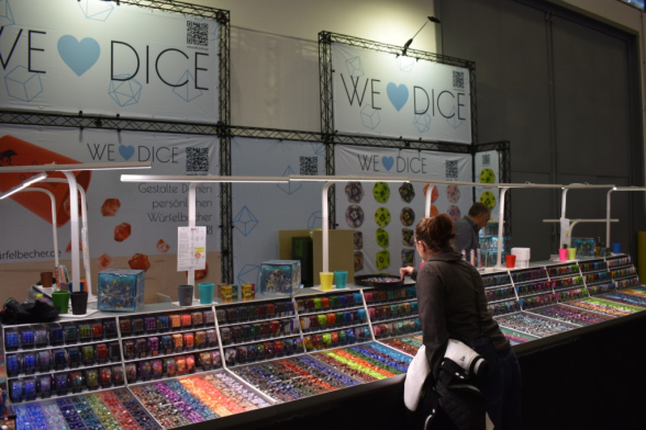 Als dann die Messe öffnete, waren ein paar Ausstellende überrascht, dass sich die Stände so schnell füllten, denn im Gegensatz zum letzten Jahr war die Messe dieses Jahr wieder in den Ferien. Wir klapperten erst einmal ein paar Stände zum hallo sagen ab. Um dann den Geheimtipp zu bekommen: Am Stand von We love dice gab es nicht nur die offiziellen Spielwiesn 2025 Würfel, sondern auch andere… sagen wir Abwandlungen. Und das auch noch lokal produziert!