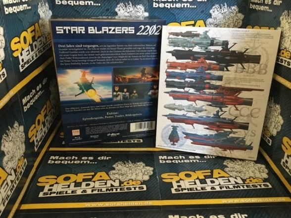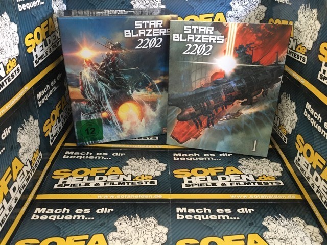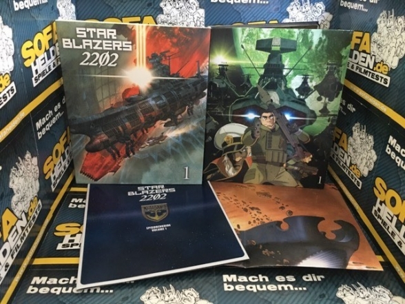 Die erste Volume von Star Blazers 2202 wird in einem großen Schuber geliefert, in dem noch Platz für die kommenden vier Volumes ist. Die Blu-ray selbst ist einem schmalen Pappschuber mit einem schönen Artwork. Aufgeklappt offenbart sich die Blu-ray, ein Mini-Poster in DIN A4 Format und ein Booklet mit einem anschaulichen und schön gestalteten Episodenguide (siehe Fotos).