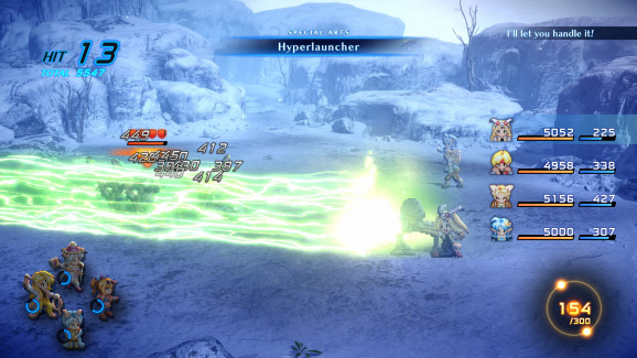 Die Geschichte, die irgendwann bis zu 13 wichtige Charaktere inkludiert und in 99 Enden münden kann, ist definitiv das Highlight des Spiels. Sie ist nicht nur spannend, sondern überrascht an vielen Stellen mit Twists & Turns, die einem guten Anime entsprungen sein könnten. So läuft man durch die verschiedenen Areale und spricht mit zahlreichen Figuren oder kämpft. Das Kampfsystem ist dabei nicht rundenbasiert, sondern man kämpft in Echtzeit in einem eigenen Bildschirm zusammen mit seinen Kumpanen gegen die Kreaturen der Galaxie. Dennoch kann man auch kurz die Zeit anhalten, um beispielsweise Zaubersprüche seines Magiers auszuwählen. Nach einem Kampf kann man sich mit Fähigkeitspunkten spezialisieren, und seine Figuren verbessern. Wie üblich gibt es auch Städte, die man erkunden kann, sowie massig Items auf der Reise zu finden. Ein klassisches Rollenspiel sozusagen.