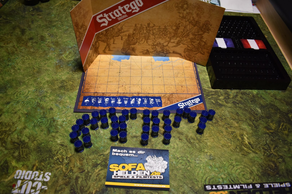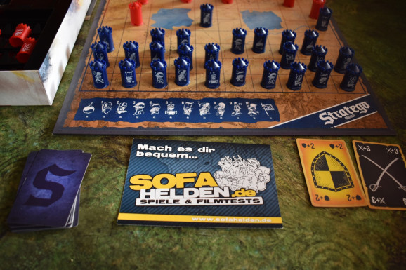 Das Spielmaterial zu Stratego Original ist sehr umfangreich. Neben dem Spielplan und einem Sichtschutz gibt es achtzig Spielfiguren und zwei in Banderolen gehüllte „Battle Cards“, die dieser Edition die besondere Würze geben sollen. Ein wenig negativ fiel uns hier auf, dass man das Kunststoffinlay, das als Sortierkasten für die Figuren so manchem Monk feuchte Träume bescheren sollte, noch einmal in Folie eingeschweißt war. Das hätte man sicherlich etwas umweltfreundlicher lösen können. Davon abgesehen ist aber sowohl die Verpackung als auch das Spielmaterial sehr gut gelungen. Die Spielfiguren sind kleine Türmchen, die von der einen Seite neutral und von der anderen Seite spezifisch bedruckt sind. Die Karten sind eher schlicht gehalten, was so leichte Retrogefühle aufkommen lässt.