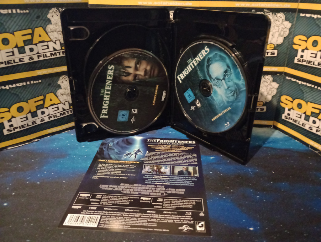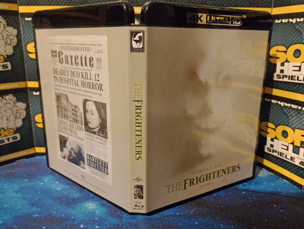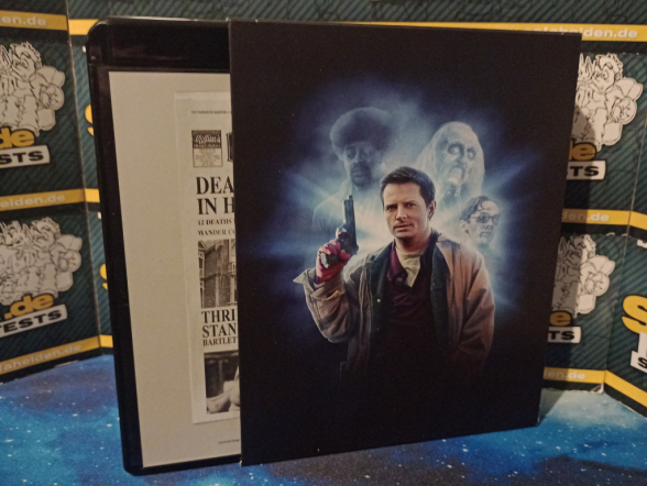 Die Full Slip Edition bietet auf dem Slip-Cover das gleiche Motiv wie die Mediabook-Variante C und zeigt im Vordergrund Michael J. Fox und Trini Alvarado gemeinsam mit dem Sensenmann, während im Hintergrund einige Geister sowie das "Licht am Ende des Tunnels" zu sehen sind. Die Rückseite zeigt dagegen Frank Bannister mit seinen drei Geister-Kollegen, während das Infoblatt mit den üblichen Inhaltsangaben und Details lediglich lose aufgelegt wurde. Die Softbox im Inneren bietet schließlich das altbekannte Covermotiv von The Frighteners, welches auch auf der Mediabook-Variante A zu sehen ist. Auf dem Backcover ist ein Zeitungsausschnitt aus der Fairwater Gazette zu sehen, der sich mit dem Fall Johnny Bartletts beschäftigt. Die drei Discs der Full Slip Edition umfassen die Kinofassung sowie den Director´s Cut, jeweils auf einer 4K UHD, sowie eine Bonus Blu-ray mit über sechs Stunden Extras, wobei vor allem das 95-minütige Interview mit Cast & Crew sowie das unglaubliche 270-minütige Making-Of hervorzuheben sind. Cover & Bilder © Turbine Medien GmbH / Produktfotos: www.sofahelden.de Das Fazit von: MarS