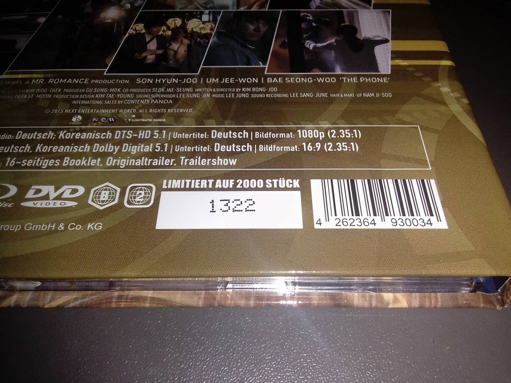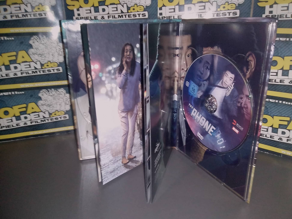 Busch Media Group hat das Mediabook zu The Phone auf 2.000 Exemplare limitiert. Im Gegensatz zur DVD- beziehungsweise Blu-ray Variante, die recht einfach aufgebaut sind und die Hauptfigur Ko Dong-Ho als zentrales Element präsentieren, bietet das Mediabook ein Alternativcover, dessen zweigeteilte Darstellung von Gegenwart und Vergangenheit perfekt die beiden Zeitebenen des Films widerspiegelt. Wie bei Busch Media Group üblich ist das Cover dabei gänzlich frei von störenden Zusatztexten, denn diese befinden sich auf dem einfach abzulösenden Deckblatt. Die Rückseite des Mediabooks wurde mit den obligatorischen Angaben zum Inhalt und den Details bedruckt, und zeigt zudem die zugehörige Limitierungsnummer. Auf dem Innendruck des mit einem Hochglanzfinish versehenen Mediabooks sind die drei zentralen Figuren des Films zu sehen, wogegen die beiden Discs das Cover der DVD- und Blu-ray Variante aufgreifen. Das 16-seitige Booklet, entstanden in Kooperation mit dem Deadline-Magazin, bietet abschließend einen erneuten Einblick in die Handlung, sowie einige zusätzliche Infos zur Produktion und zahlreiche Szenenfotos. Cover & Bilder © Busch Media Group GmbH / ©jeong kyung hwa / Produktfotos: www.sofahelden.de Das Fazit von: MarS