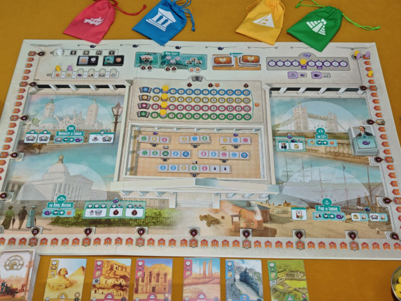 • Auch am Spielende gibt das Museum Punkte. Für jedes Sammlungsplättchen, das im Spielverlauf vollständig mit Relikten beliefert wurde, gibt es 12 Prestige für denjenigen, der dort die meisten Relikte ausgestellt hat. Ist das Plättchen nicht voll, gibt es 6 Prestige für denjenigen mit der Mehrheit.