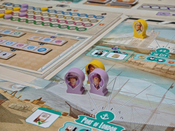 Schauen wir uns nun die vier Ortsaktionen an. Der Ort „Port of London” ist der Ort, den alle besuchen wollen, um die Aktion „eine Expedition organisieren“ auszuführen. Allerdings muss man zunächst einige Vorbereitungen treffen: Expeditionskarten haben Voraussetzungen und Kosten wie Wissen, Expertise, Geld und Ansehen. All dies lässt sich z. B. über andere Aktionen auf dem London-Spielplan organisieren (siehe unten). Die Karten aus der Auslage können Ansehen entsprechend des auf dem Spielplan abgedruckten Wertes kosten; je weiter links sie liegen, desto mehr. Außerdem kosten Expeditionen Geld, wie auf der Karte oben links abgedruckt. Weitere Wissens- und Expertise-Voraussetzungen sind ebenfalls auf der Karte oben links vermerkt. Man darf aber jeweils 2 Ansehen zahlen, um die Geldkosten um 3 und die Wissensvoraussetzung um 1 zu reduzieren. Außerdem haben die drei Arbeiter besondere Fähigkeiten und bringen z. B. Wissen in einer bestimmten Region oder Logistik-Fähigkeiten mit, welche die Geldkosten oder Wissensvoraussetzung faktisch weiter reduzieren können. Hat man alles verrechnet und bezahlt, erlaubt es die Aktion, eine Expeditionskarte aus der Auslage oder von seiner Hand auszuspielen und die Belohnungen abzukassieren, die unten auf der Karte abgedruckt sind. Das sind meist Siegpunkte, Relikte und andere Boni. Relikte werden dabei entweder zufällig aus einem Beutel gezogen (Symbol: geschlossenes Auge) oder können ausgewählt werden (Symbol: offenes Auge).