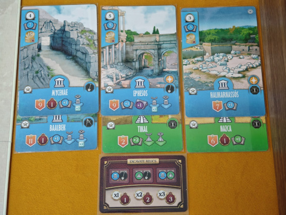Oberhalb des Spielplans wird der gemischte Kartenstapel mit Expeditionskarten ausgelegt, wovon sechs offen in die Auslage kommen. Sie existieren in vier Farben (Rot, Grün, Gelb, Blau), entsprechend den vier Regionen im Spiel (Afrika, Mittelmeer, Asien, Südamerika). Erfüllt man die oben links auf der Expeditionskarte aufgeführten Bedingungen, kann man im Spielverlauf die entsprechende Expedition ausführen und die im unteren Bereich angegebenen Belohnungen erhalten. Das sind häufig auch farblich passende Reliktmarker. Diese werden in den farblich passenden Stoffbeuteln sortiert und von dort oft zufällig gezogen.