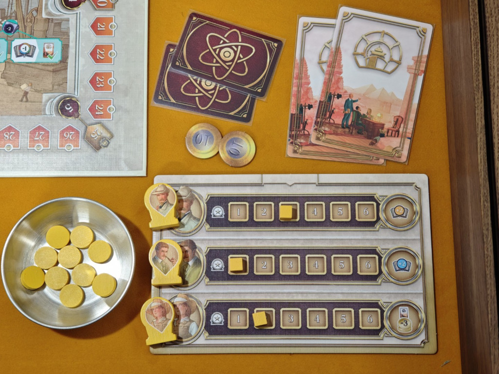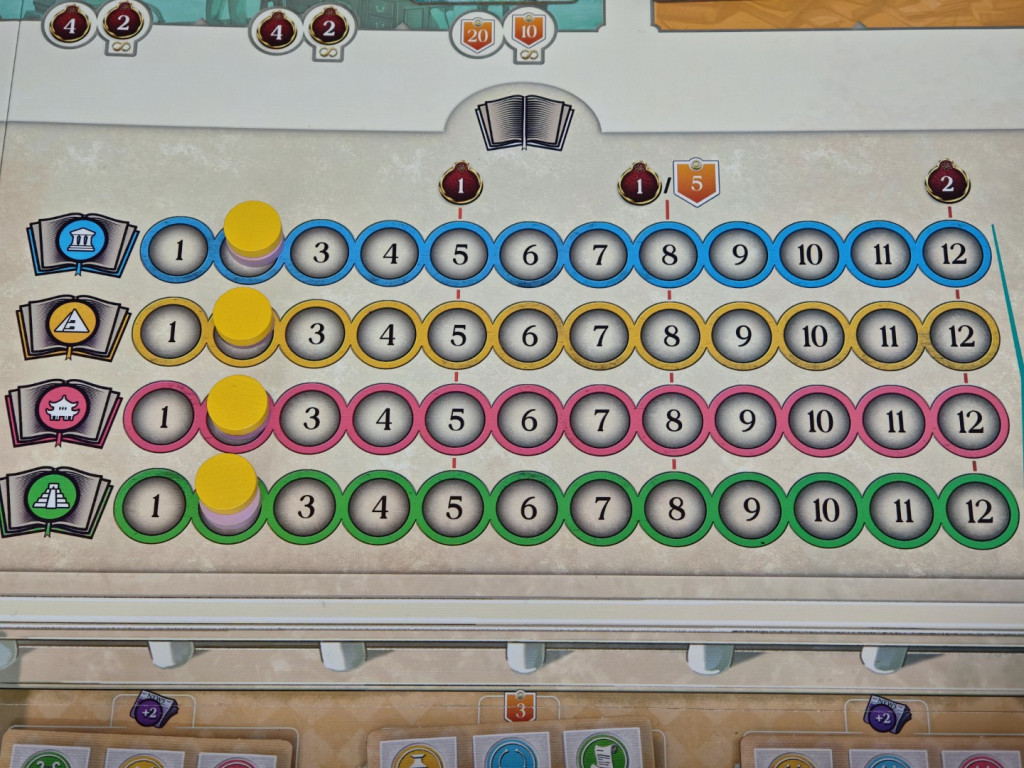 Der Spielplan zeigt mehrere Leisten, auf denen die Spieler ihre Marker platzieren. In der Mitte des Spielplans befinden sich vier Wissensleisten, die jeweils einer der vier Regionen zugeordnet sind. Das Wissen in einer Region ist eine der Voraussetzungen für dortige Expeditionen. Um den Spielplan herum verlaufen die Prestige- und Gelehrsamkeitsleisten. Am Spielende entspricht die Punktzahl des am wenigsten fortgeschrittenen Markers den erreichten Siegpunkten. Oben rechts befindet sich die Ansehensleiste. Ansehen ist teils Ressource und teils Voraussetzung für das Ausführen bestimmter Aktionen.