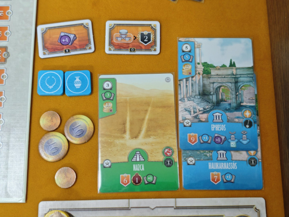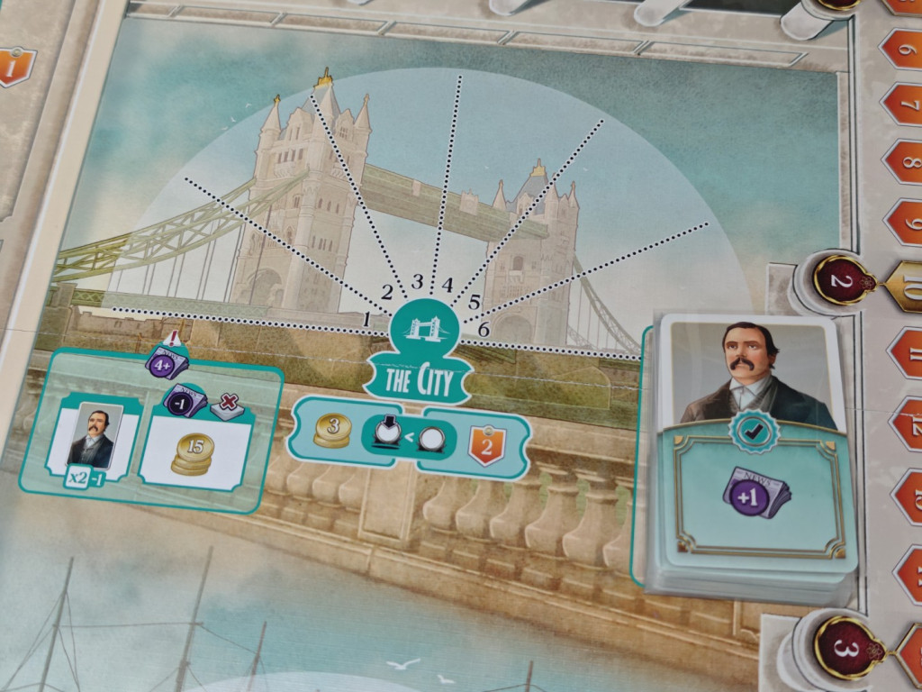 Der Ort „The City“ hält zwei Aktionen bereit, mit denen man an Geld kommt. Die erste Aktion „einen Gönner treffen“ erlaubt es, zwei Gönnerkarten zu ziehen und eine auszuwählen, die man vor sich auslegt. Man erhält je nach gewählter Karte drei bis fünf Geld pro Expertise des eingesetzten Arbeiters. Man muss allerdings die Nebenaktion „einem Gönner danken“ ausführen, damit die Karte am Spielende keine negativen Siegpunkte gibt! Alternativ kann man die Aktion „ein Relikt verkaufen“ ausführen: Man verliert ein Ansehen und einen Reliktmarker, erhält dafür aber 15 Geld.