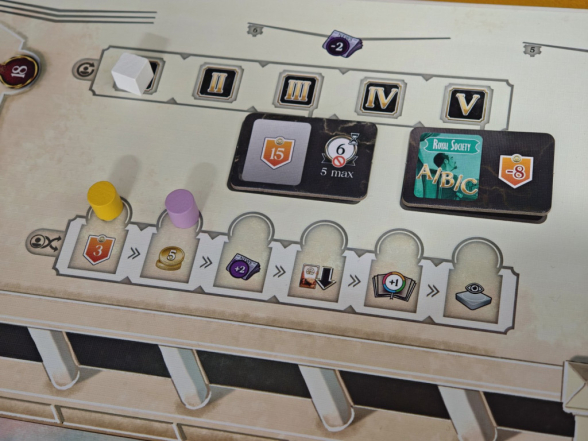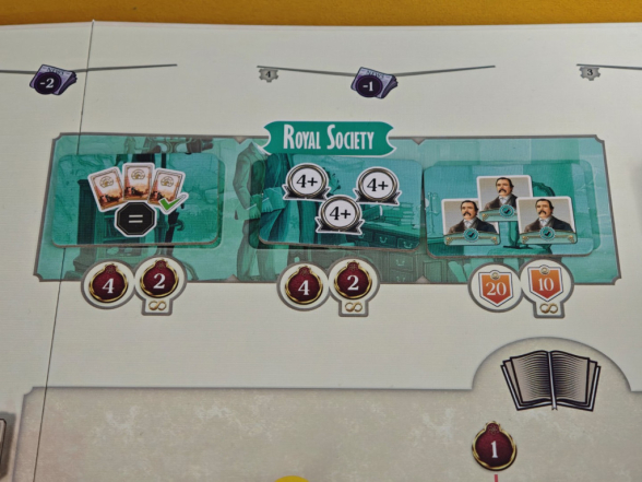 Und zu guter Letzt gibt es in The Royal Society zwei Siegpunktleisten: Prestige und Gelehrsamkeit. Am Spielende zählt nur der Punktewert der Leiste, auf der man am wenigsten weit vorangeschritten ist. Man sollte also schön darauf achten, beide Leisten zu pushen!