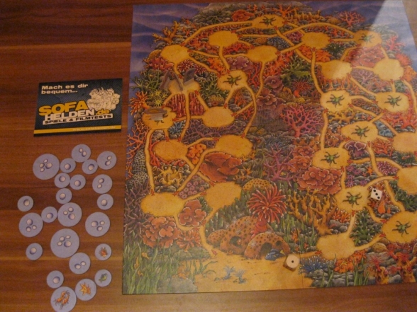 Der Karton des Spiels ist quadratisch und sticht mit seiner Größe aus den übrigen Herbstneuheiten hervor. Im Inneren finden sich neben dem Spielplan, der mehrfach aufgefaltet werden muss, ein Kartonbogen mit den Spielfiguren und -plättchen und ein Beutel mit den Kunststofffüßen für die vier Fische. Vor dem ersten Spiel müssen erst alle Spielplättchen und Fische aus dem Bogen herausgedrückt und die Fische mit den Füßchen zusammengesteckt werden. Hier sollte man besonders achtgeben und die Füßchen vorsichtig auseinander drücken, da sich sonst beim Zusammendrücken die einzelnen Pappschichten voneinander lösen können. Hat man alle Pappteilchen ausgedrückt und die Figuren zusammengebaut, kann man auch schon loslegen. Die Spielplättchen werden mit den Bläschen nach oben auf den freien Flächen des Spielplans verteilt und die Fische auf das Startfeld bei der roten Anemone gestellt. Wichtig ist, dass die Spielfelder und -wege frei bleiben. Nun erhält der Spieler, der zuletzt in einem Aquarium war den Würfel und darf das Spiel beginnen.