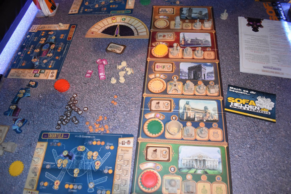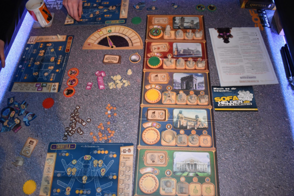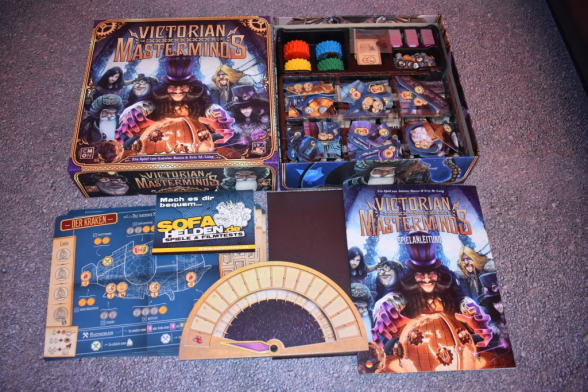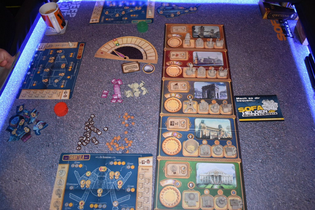 Der eigentliche Spielaufbau geht relativ flott. Als erstes wird der Spielplan mitsamt der Gebäude auf ihren Feldern in die Tischmitte gelegt. Das Geheimdiensttableau wird entsprechend der Spielerzahl eingestellt und jeder Spieler legt einen Feuermarker seiner Farbe auf das Feld mit der Eins. Außerdem erhält jeder Spieler noch die Komplizen-Chips in seiner Farbe. Hinzu kommt noch jeweils ein zufällig ausgewählter Maschinenbogen mitsamt der zugehörigen Maschinenteile. Darauf darf sich jeder Spieler einen Wissenschaftler stellen. Jeder Spieler mischt seine Komplizen-Chips und legt sie verdeckt als Stapel vor sich bereit. Dann werden noch die Auftragskarten nach ihren Rückseiten gemischt. Die hellen Startkarten werden offen auf die Felder des Spielplans verteilt. Die übrigen werden als Nachziehstapel mitsamt der übrigen Chips und den Wissenschaftlerfiguren als Vorrat bereitgelegt. Nun könnte man noch einen fiesen Witz erzählen, um zu ermitteln wer die böseste Lache hat, denn dieser Spieler ist der Startspieler…