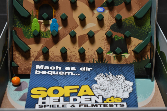 Unter den Spielen, die man auf einem schrägen oder komplett aufgestellten Spielbrett spielt, ist das hier eins der Besten. Zum einen fallen die Figuren durch die „Nut“-Form nur sehr selten von den Klippen, zum anderen gibt es viele Möglichkeiten zu gewinnen, da die Edelsteine unterschiedliche Punkte geben. Für mich in der Kategorie Kinderspiel eine 10, da der Zufall hier die Kinder auch gegen Erwachsene gewinnen lassen kann. Die Taktik spielt eine etwas kleinere Rolle.