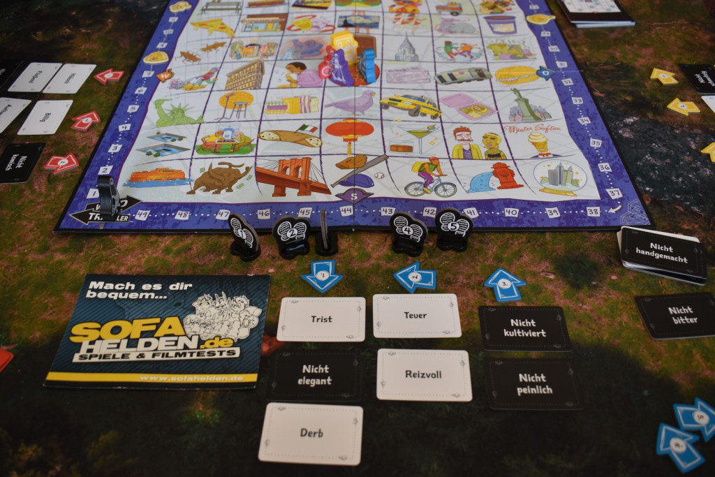 Für den Spielaufbau müsst Ihr Euch als erstes für eine Stadt entscheiden und legt den Spielplan mit der entsprechenden Seite nach oben in die Mitte. Nun nehmt Euch alle jeweils einen Reisepass und die dazugehörigen Richtungspfeile. Die Figuren Eurer gewählten Farbe stellt Ihr in die Mitte und die schwarze Taube auf das Startfeld der Punkteleiste. Entsprechend eurer Personenanzahl legt Ihr die Souvenirmarker auf die jeweiligen Punkte der Punkteleiste. Fußabdrücke und Sanduhr sowie die Wortkarten werden ebenfalls bereitgelegt.