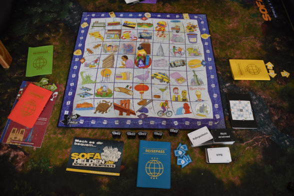 Zum Spielmaterial gehören zwei beidseitige Spielpläne mit den Stadtplänen der vier Städte. Außerdem gibt es sechs Spielfiguren aus Holz, eine Sanduhr und fünf Reisepässe aus Kunststoff, die später für die geheimen Reiserouten gedacht sind. Damit die Wege durch die Städte auch gefunden werden können, gibt es drei Kartenstapel mit Hinweiskarten. Außerdem noch Kunststofffüße für die Fußabdrücke und einen Stanzbogen mit Fußabdrücken und Pfeilen in den fünf Spielfarben. Damit das Ganze auch lehrreich ist, gibt es zu jeder Stadt noch eine Übersicht der Sehenswürdigkeiten mit kurzen Beschreibungen. Insgesamt macht das Spielmaterial einen sehr guten Eindruck. Lediglich der hohe Kunststoffanteil bei den Karten (immerhin Zipp-Beutel), ist ein kleines Defizit in der heutigen Zeit. Für die allgemeine Vorbereitung bietet es sich an, dass Ihr schon einmal die Spielhilfe-Karten in die Reisepässe einsteckt.