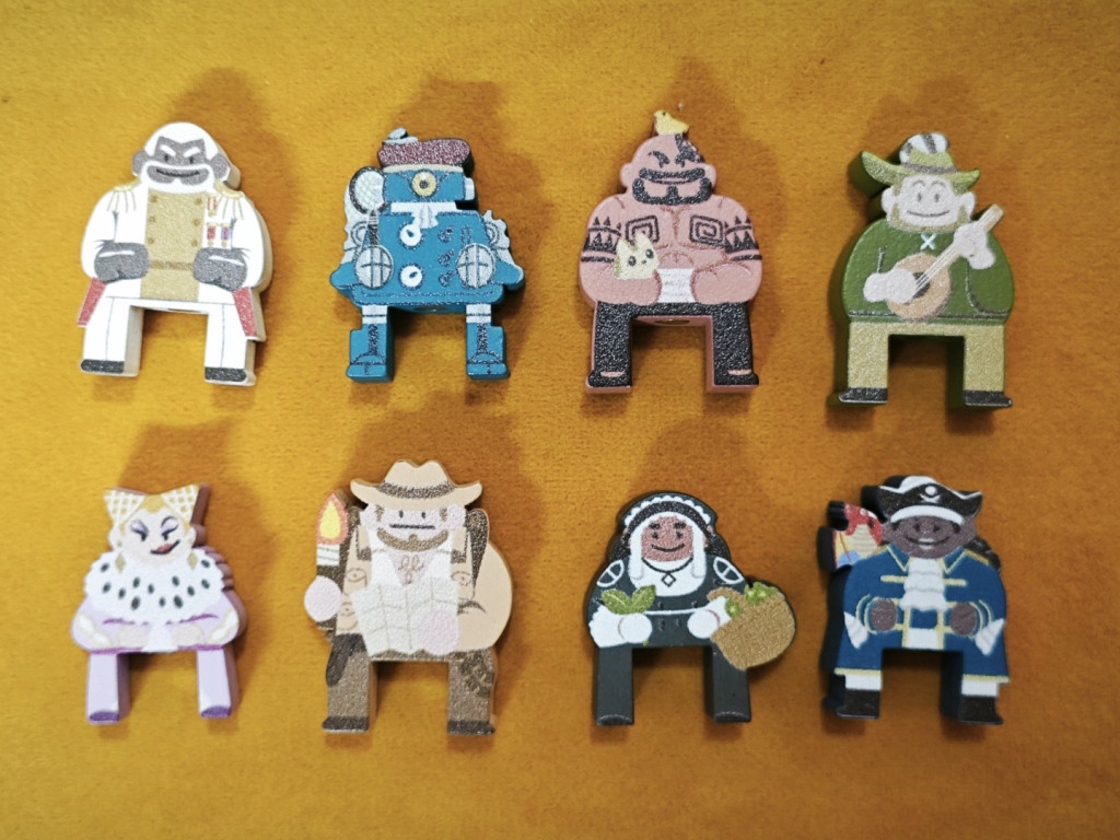 Letztlich platziert jeder Spieler seinen Punktemarker auf die Siegpunkteleiste des Spielplans und nimmt sich seine drei Besatzungsmitglieder. Eine der drei Besatzungsmitglieder hat einen kleinen Magneten auf dem Rücken. Auf diese Figur wird der Kapitän platziert, der ebenfalls magnetisch ist. Kapitäne haben unterschiedliche Fähigkeiten. Jeder Spieler erhält zwei Kapitänskarten, von denen er sich eine aussucht. Die Kapitänskarte wird auf das Spielertableau platziert. Darauf kommt dann noch das Gesperrt-Plättchen, um anzuzeigen, dass die Kapitänsfähigkeit noch nicht freigeschaltet ist. Gleichzeitig zu den Kapitänskarten erhält jeder Spieler acht Wesenskarten, von denen vier behalten und die restlichen vier abgeworfen werden müssen. So bildet man seine Starthand. Ist alles vorbereitet, kann es endlich losgehen.
